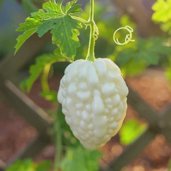 White Apple Bitter Melon produces creamy white, heart-shaped fruit that stands out from traditional green varieties. This elegant climbing vine is perfect for trellis growing and ideal for Asian-style home gardens.